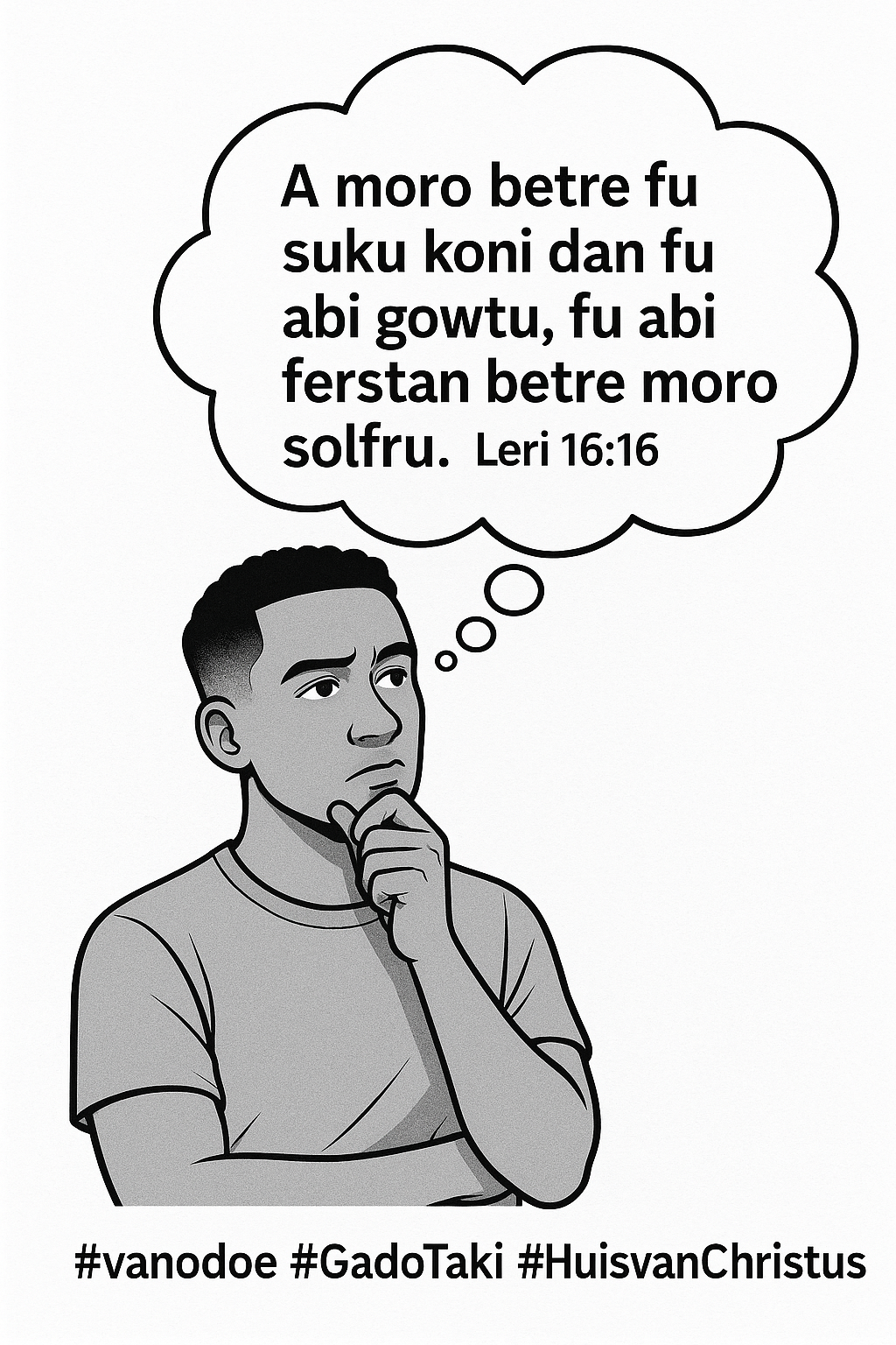 Vanodoe is de serie waar Surinaamse wijsheid — straatwijs, warm en soms pijnlijk eerlijk — een plek krijgt binnen de Common Sense vormtaal. Geen lange preken, geen ruis: korte zinnen die je hoofd stil krijgen en je hart wakker maken.